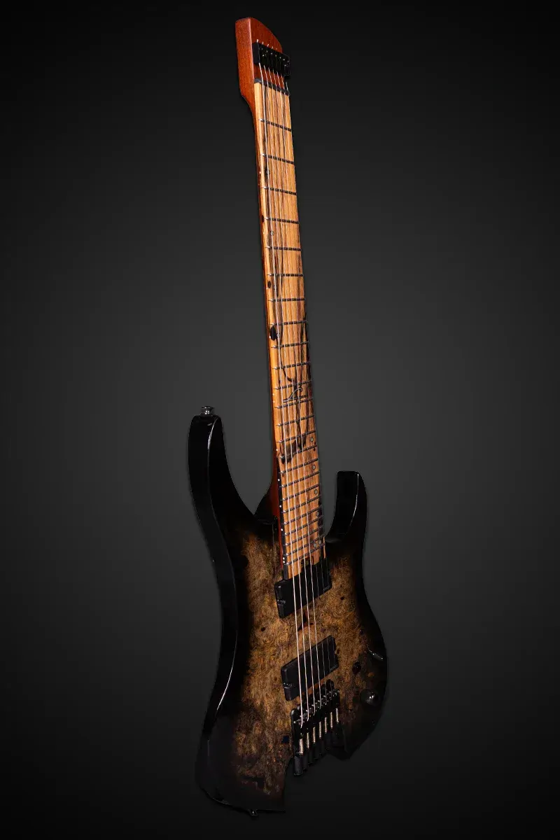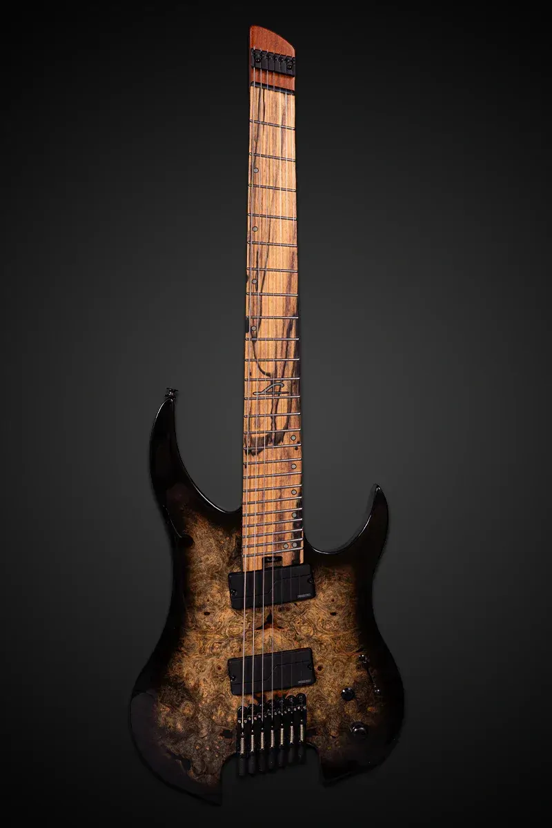 The Legator G7FOD Ghost Overdrive 7-String in Jupiter Burst Gloss is designed for modern players who demand precision and power. Its alder body with a California Buckeye Burl top offers resonance and striking aesthetics, while the 25.5"–26.5" multi-scale design optimises tension and intonation across all strings. The roasted maple neck and 18" radius pale moon ebony fingerboard provide smooth, fast playability with Luminlay side dots for visibility in low light. Fishman Fluence Modern pickups with push/pull voice selection deliver a wide range of aggressive, articulate tones, while the LED killswitch adds on-the-fly performance control. A locking head bar and fine-tuning bridge ensure rock-solid tuning stability. A