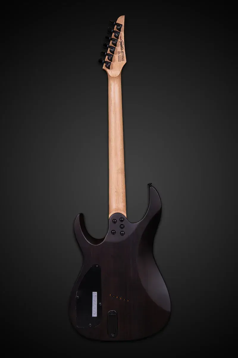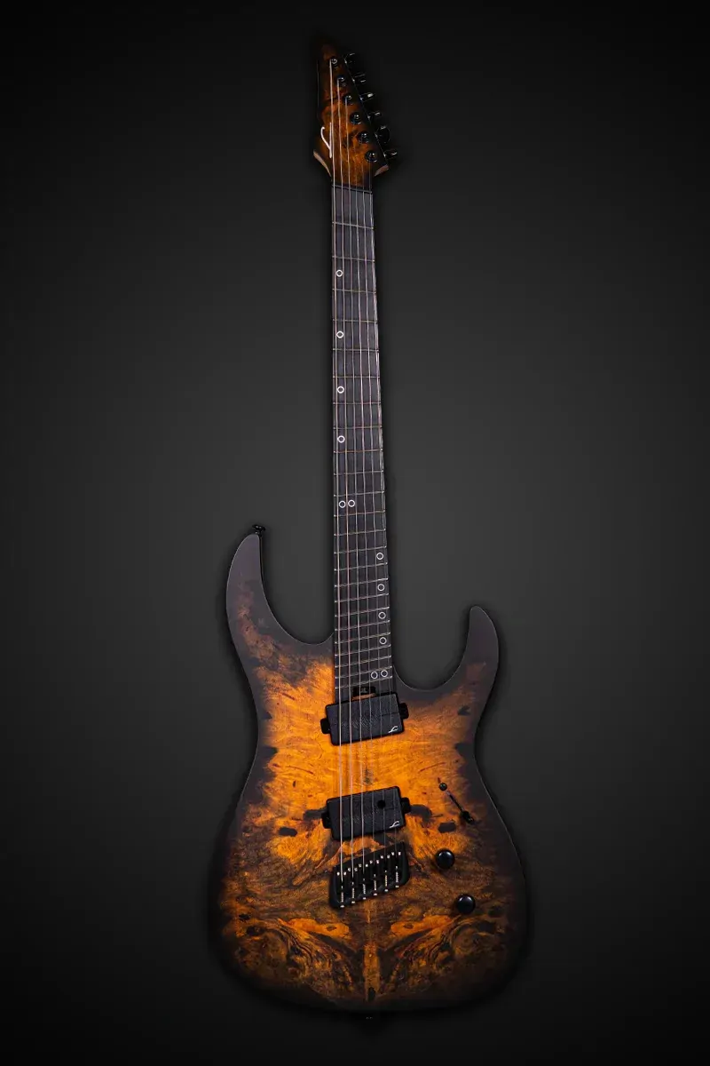 The Legator N6FSS Ninja Super Shred 6-String in Death Valley Buckeye Burl is built for players who demand speed and power. Its lightweight 38mm mahogany body with a stunning buckeye burl top provides resonance and visual appeal, while the 25.5"–26.5" (648–673mm) multi-scale design improves intonation and string tension. The 3-piece bolt-on maple neck with a 14"–16" compound radius Richlite fingerboard ensures smooth playability, enhanced by 24 jumbo stainless-steel frets for durability. Legator Aftershock active humbuckers deliver tight, crushing tones, with controls for master volume, master tone, and a 3-way blade switch. A Graphtech nut, brass multiscale bridge, and locking tuners ensure rock-solid tuning stability.