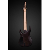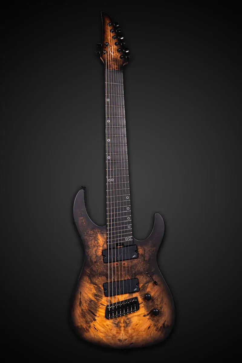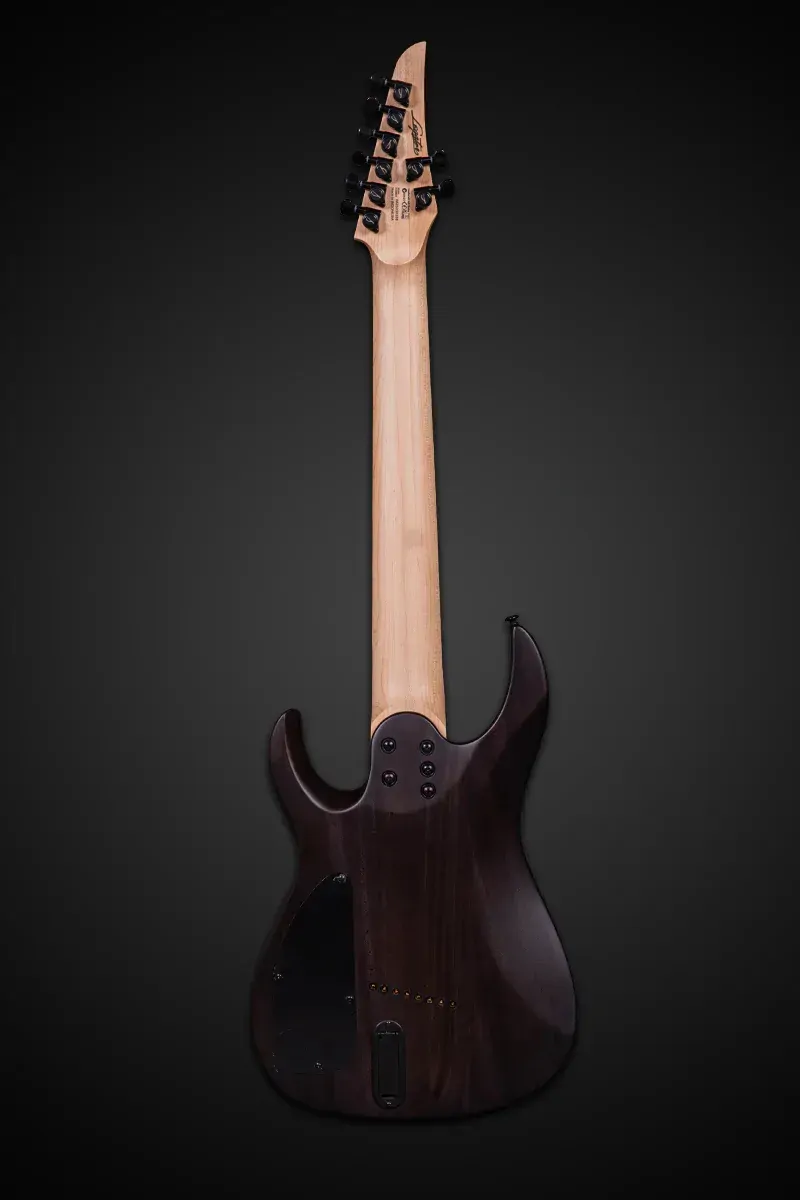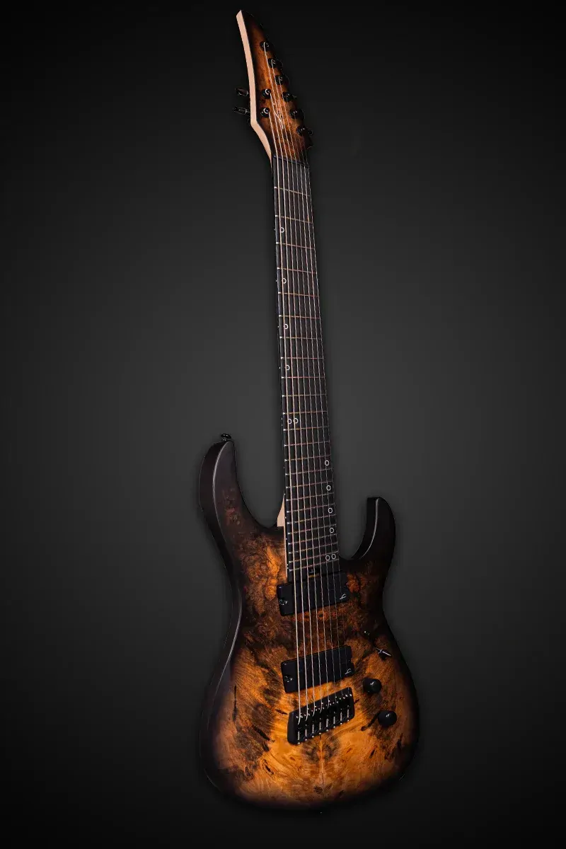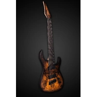 The Legator N8FSS Ninja Super Shred 8-String in Death Valley Buckeye Burl is designed for players seeking maximum range, precision, and speed. Its 38mm-thick mahogany body with a buckeye burl top delivers a resonant, aggressive tone, while the 26.5"–27.5" (673–699mm) multi-scale design ensures even tension and accurate intonation across all eight strings. The 3-piece bolt-on maple neck and 12"–16" compound radius Richlite fingerboard offer a fast, smooth feel, paired with 24 jumbo stainless-steel frets for effortless shredding. Legator Aftershock active humbuckers provide high-output clarity and punch, while a Graphtech nut, brass multi-scale bridge, and locking tuners deliver excellent tuning stability.